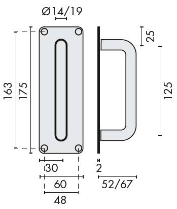 Poignée de tirage sur plaque Ø 14 mm, 175x60 mm, inox brossé 316